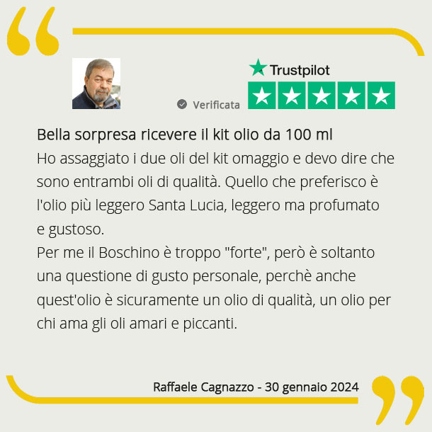 👉Garanzia 100% soddisfatti o rimborsati per il nostro Kit assaggio! Se entrambi i nostri oli (equilibrato e fruttato) non ti soddisfano o non sono di tuo gradimento ti rimborsiamo le spese di consegna entro 48 ore dalla richiesta.