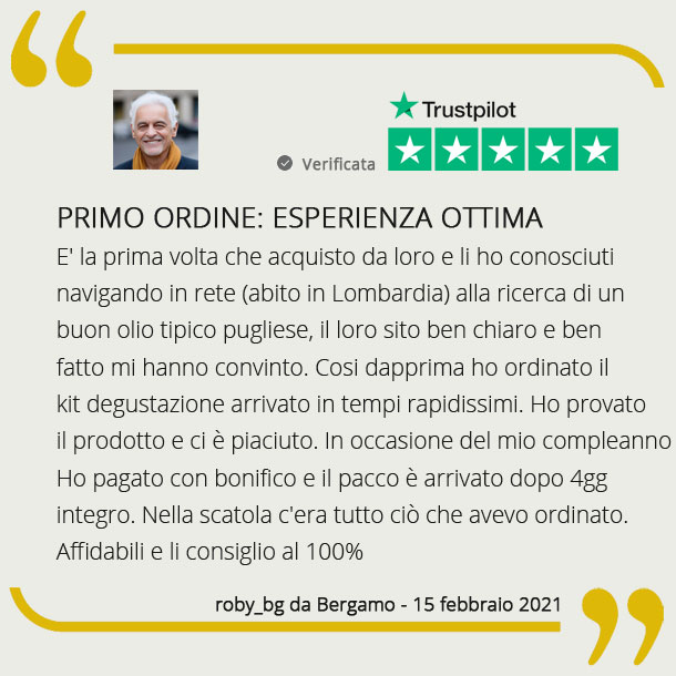 Ti farò arrivare comodamente a casa ed in sicurezza con il servizio del corriere espresso l’Olio Extra Vergine di Oliva di qualità CERTIFICATA Equilibrato o Fruttato direttamente dal produttore!